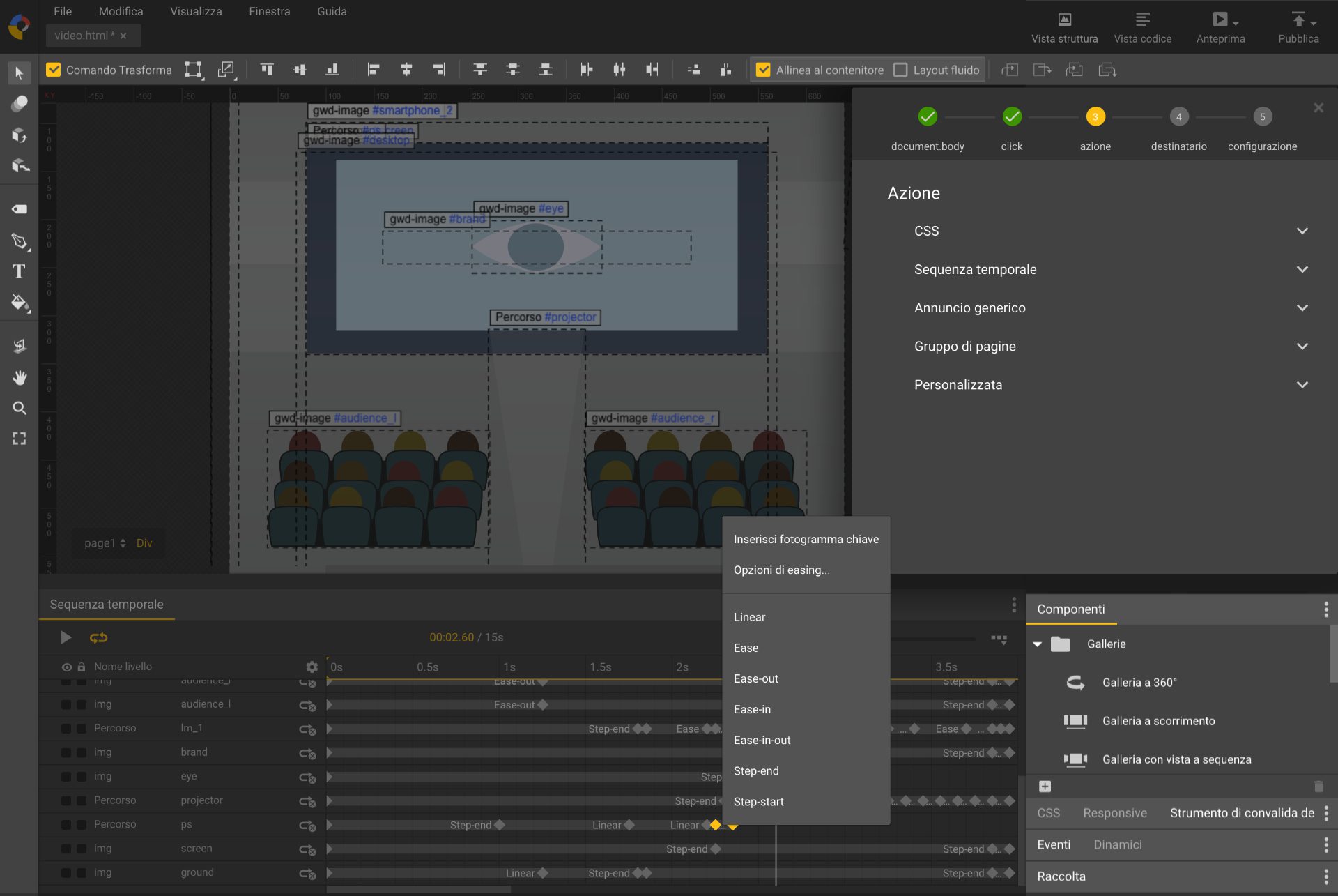 C’è anche la gestione delle azioni che consente di associare eventi (touch e quindi gestures, mouse, ecc…) ai componenti e di rendere interattive le animazioni, spostarsi all’interno delle sequenze, modificare gli stili e inserire collegamenti ipertestuali.